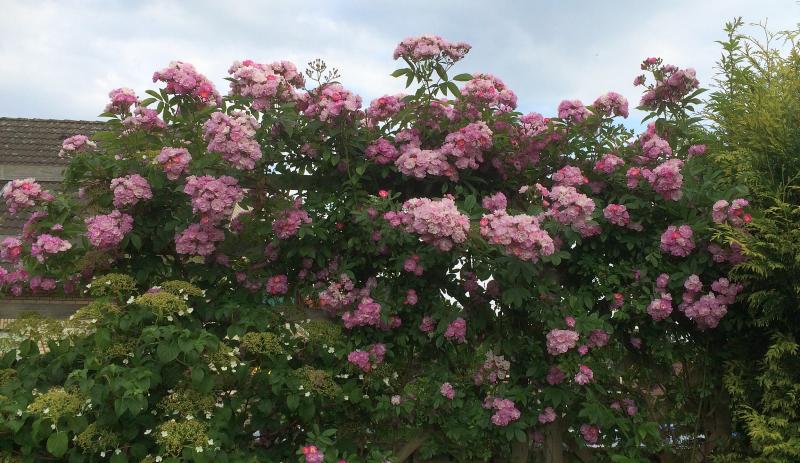 Viele Rosen haben in meinem Garten lange Beine bekommen. ´Parkjuwel´wurde eigentlich nicht als Kletterrose gekauft, hat es aber 4 m hoch in Eibe und Flieder geschafft.
