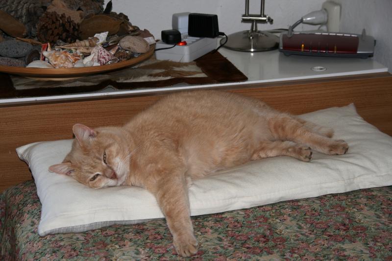 Das Alter ist halt auch da, auch wenn man es nicht so wahrhaben will. Sie hat ja erst im Winter auch die Vorteile einer immer warmen Stube kennen-und-schätzen gelernt. Daran sieht man, was sie für schlaues Mädchen ist. Drücke Euch die Daumen, das nichts besorgniserregendes rauskommt beim Tierarzt. Freue mich immer, wenn ich Bilder von ihr sehe. Mein Rudi liegt im Büro auf seinem Kissen und schläft tief und fest. Er war heute früh schon eine Weile draußen. Normal geht er dann wieder raus, aber heute wollte er nicht. Jetzt schläft er oben. Ich werde jetzt rausgehen in die Sonne. Ich könnte ja immer lachen, wenn er draußen ist und dann auf meiner Liege liegt, ich von der Türe aus rausschaue und ihn frage, ob er reinwill, dann dreht er den Kopf weg und ignoriert meine Frage. Dann weiß ich er will draußen bleiben. Oder wenn er drinnen nicht weiß, was er machen soll, ich ihn frage ob er rauswill, ihm die Tür aufmache, dann schaut er mich an und sagt "naaa" und geht über die Treppe hoch. Dann kenn ich mich aus. So schön ist unsere Kommunikation..... Da liegt er jetzt.....