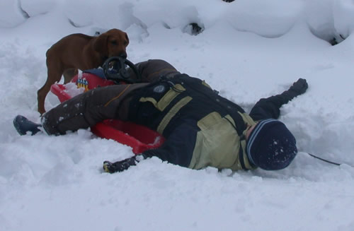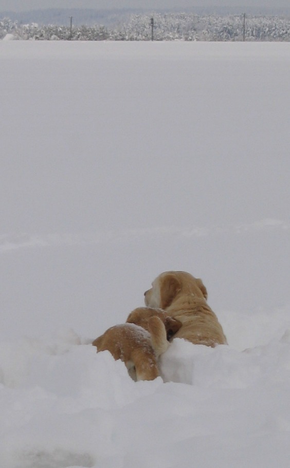 :-XDa lach ich aber nicht mehr. Meine kaempfen sich gerade zu dritt mit Herrchen durch den vielen Neuschnee! Vor allem unser Neuzugang: Als zu heiss gewaschener Labrador bekommt sie langsam Probleme noch vorwaerts zu kommen