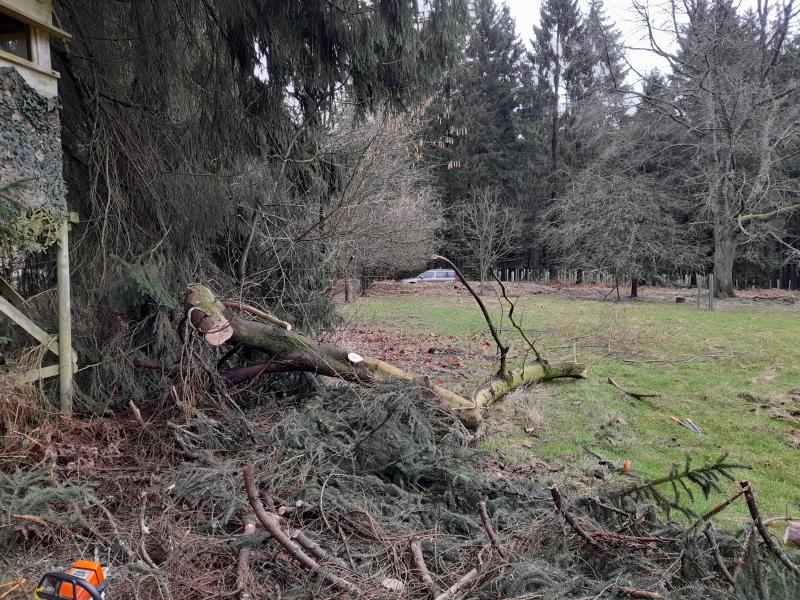 So. Heute: Zäunen auf Pralinenobst. Da liegt übrigens auch ein Baum. Eine Fichte. Dann mal hurtig die Säge angeworfen. Mittleres Exemplar. Das bekomme ich noch mit der Makita bezwungen. "Durchfahrt" für Zaun sägen. Rest gerne liegenlassen. Da freuen sich die Wollbiber. Die lieben jetzt im Winter Fichtengeschmack. Die große Herde hat gerade Weidegeschmack. Das istfür die auch besser. Weidenrinde für alte Knochen sind geradezu ideal ;D