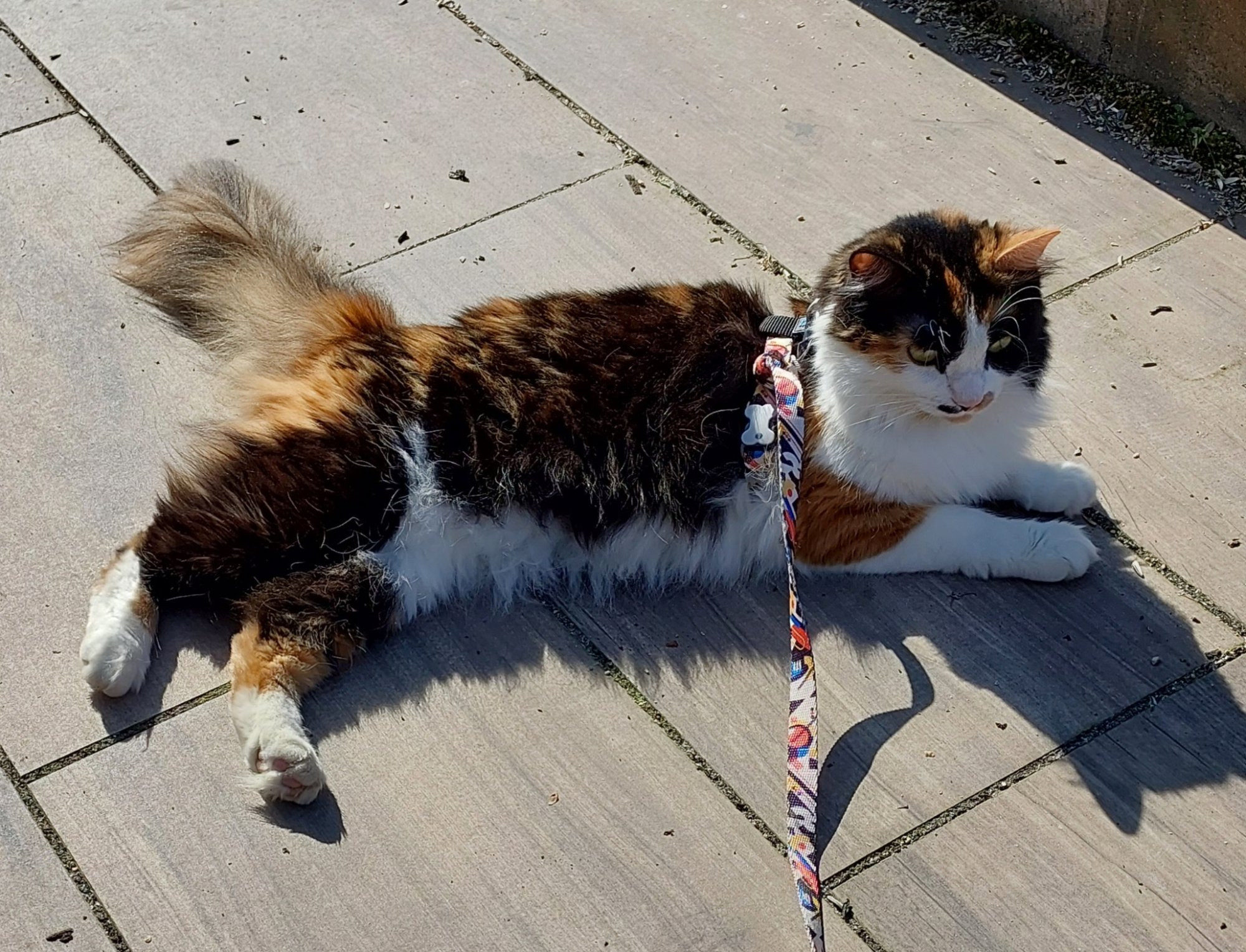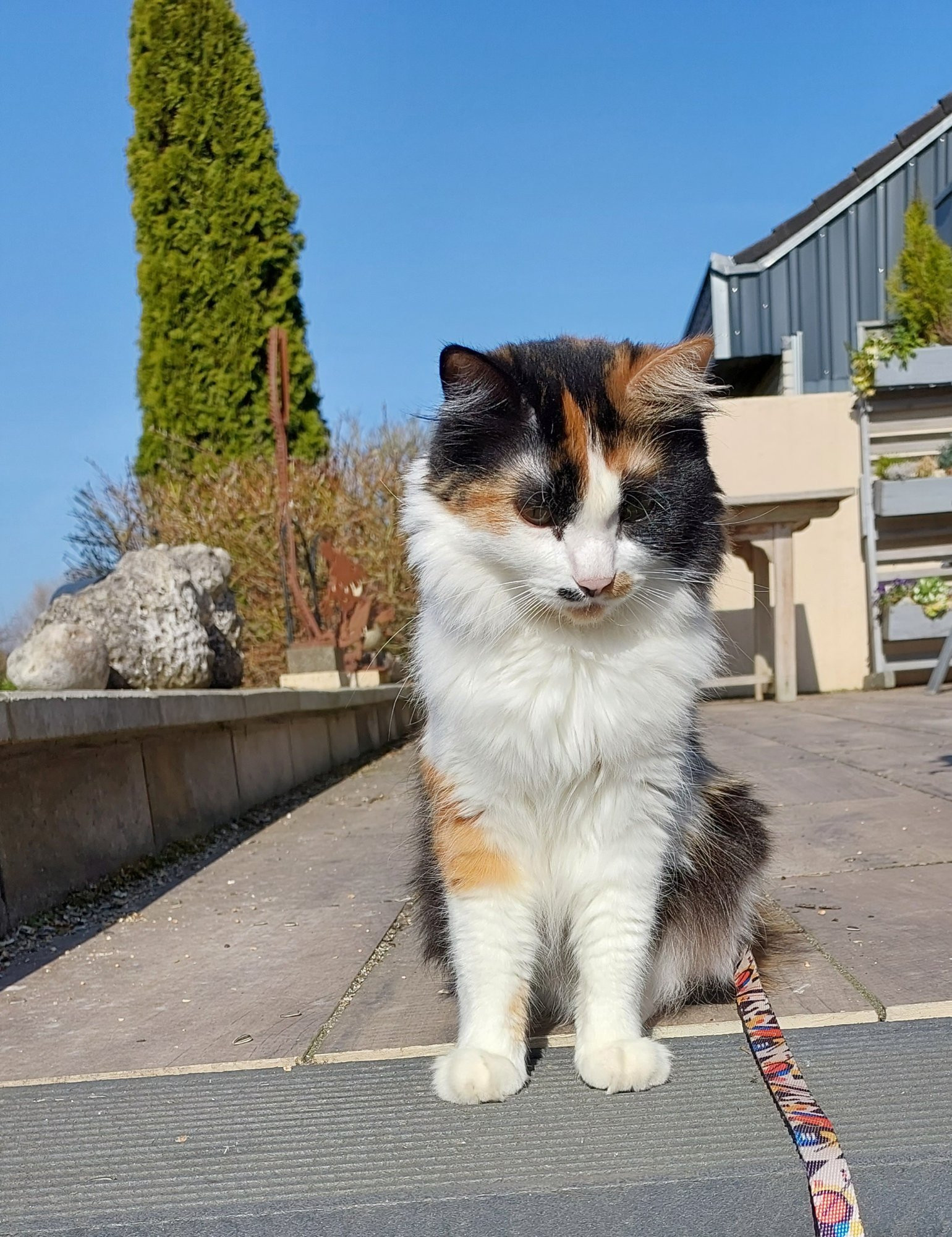 . Geht die Terrassentür auf, kommt sie angeschossen, ohne oder mit Geschirr. Also an der Leine nach draussen. Inzwischen habe ich ca. 15 m. Aber sie fühlt sich nicht wohl draussen. Schnuppert und flehmt viel, ist schreckhaft, ungeschickt im Springen, vom Hochbeet runtergefallen, mitsamt leichtem Hocker umgefallen, Schrecken, sofort zurück ins Wohnzimmer. Sie hat grenzenloses Vertrauen in mir, denn wenn sie draussen ist, muss ich in ihrem Gesichtsfeld sein. Bin ich auch nur 1 Minute weg, grosses Gejammere. Ich bin wieder da, sie springt mich an, krallt sich auf meine Schulter fest. Tut weh und mein Shirt ist perforiert. Erst drinnen kriege ich sie wieder runter, nachdem ich beschmust wurde. Sie will nicht mehr nach draussen. Bleibt (ohne Leine!!) vor der offenen Terrassentür sitzen. Sie erschrickt, wenn ein Flugzeug rüberkommt, die Nachbarskinder laut sind, etc. Nur wenn der Hund nebenan bellt, ist ihr das egal. Nur kurz auf der Terrasse, aber nah an der Tür, geht sie noch. Tja, dann eben drinnen. Warum soll ich sie nach draussen zwingen?