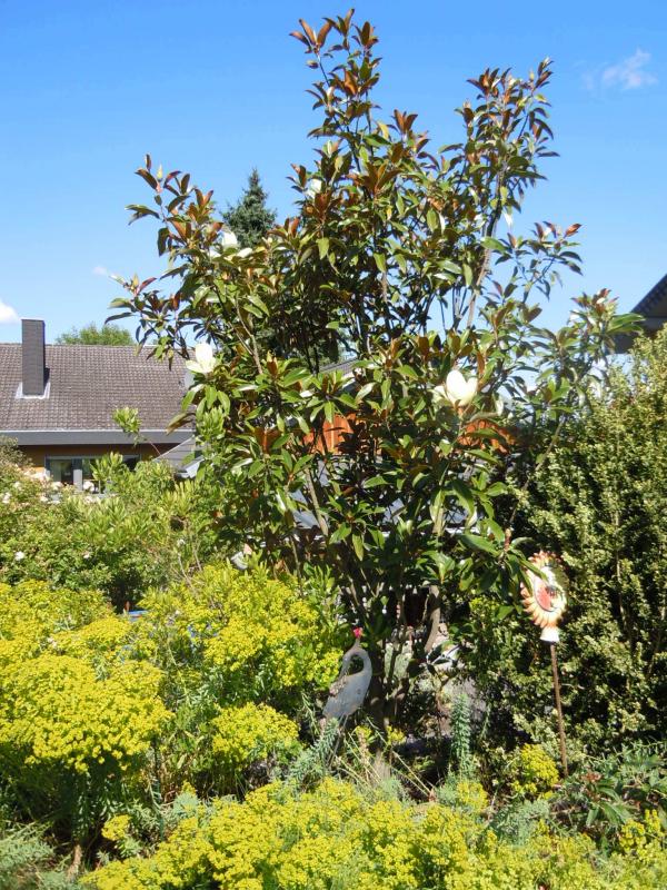 Die Immergrünen Magnolien haben im Juni/Juli ihre "Mauser" - sprich: sie werfen die älteren Blätter ab. Meine Kay Parris sah vor einigen Wochen wirklich schlimm aus - so viele Blätter wie heuer hatte sie noch nie verloren. Also kein Grund zur Sorge - das ist ganz normal.