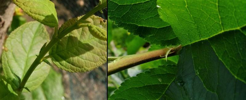 Auch die Tragblätter, also die kleinen Blättchen am Blattstiel, an der Knospe, sind unterschiedlich. Während am Baum 1 die Blätter gut entwickelt sind, sind sie am Baum 2 nicht, eher fadenförmig.