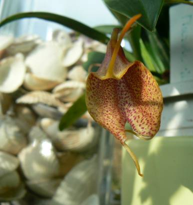 Vor zwei Jahren habe ich in einem Anfall von ?Wahnsinn? in einem großen Pflanzenmarkt, den ich manchmal heimsuche, ein paar fast abgeblühte Orchideen gekauft (heruntergesetzt). Eine davon war eine Masdevallia, die bei mir nicht richtig glücklich wurde. Den Sommer über habe ich sie - wie alle anderen Orchideen - in meinen Holunder gehängt. Als ich sie wieder einräumte, überlegte ich lange, ob ich das kleine Gestrüpp lieber gleich entsorgen sollte. Ich hab's nicht fertig gebracht, zumal sie mir kräftiger erschien. Wie überrascht war ich keine zwei Wochen später, als ich jede Menge Blütenansätze entdeckte