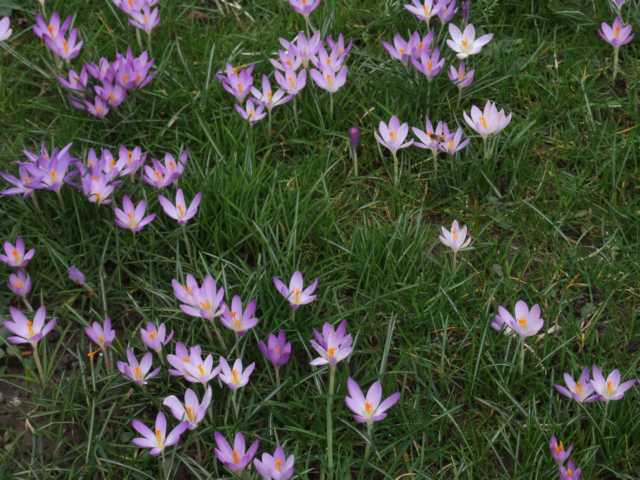Im Beet lassen sich jetzt auch die ersten sehen. Im Rasen sind immer noch nur die zart lilafarbenen mit dem gelben Kelch zu sehen.