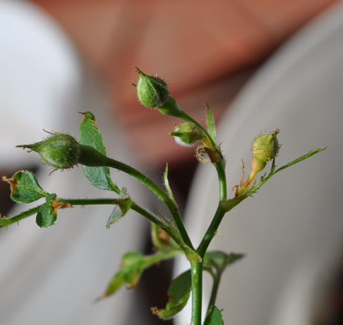 Jungrosen im September. Die sind im Juli in die Erde gekommen, zugedeckt und jetzt sehen sie so aus.Darunter hat es zwei interessante - ich meine, die tun sich speziell hervor.In einem Topf ist ein totales Gerangel. Von 10 sind 8 einfach weitergewachsen, wie wenn sie nie abgeschnitten gewesen wären. Diese heisst: Rosa multiflora Adenochaeta.Ganz links hinterste untere Reihe.Die andere hat ein Stecklein von 5 cm, darauf ein neues Trieblein auch von 5 cm. Oben sitzen winzige Rosenknospen drauf. (Die rechte gelbe habe ich nun entfernt). Die grösste Knospe misst genau 4 mm!