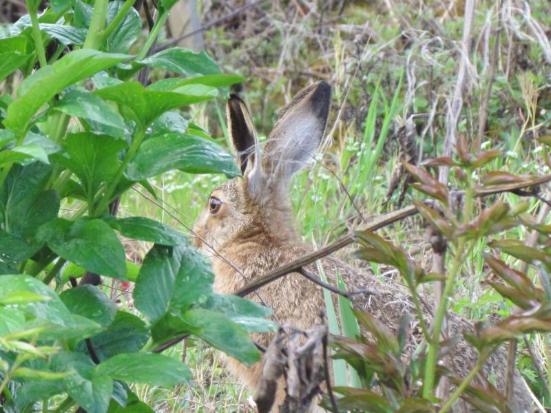 "Mein" letzter Feldhase schien verschwunden, seit dieser Woche weiß ich aber, dass ein Halbling auf dem Sammlungsacker/Zweitgarten wohnt. Heute hat er sich in einer besonders unordentlichen Ecke, welche schöne Verstecke bietet, kurz mal ein wenig präsentiert.