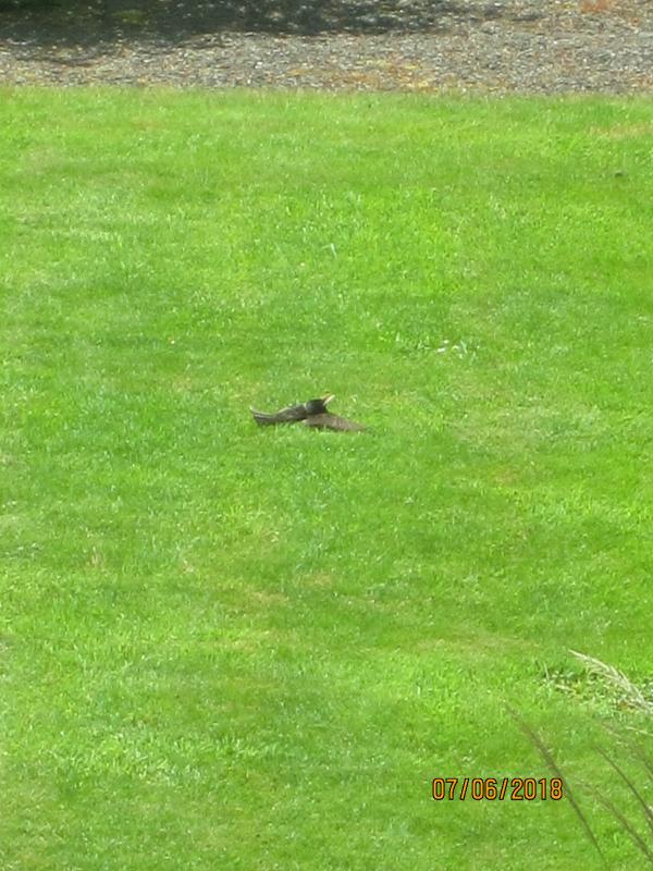 Diese Amsel ist nicht etwa verletzt, sondern liegt mit ausgebreiteten Flügeln in der Sonne herum. Auf dem Kiesweg lag auch eine, inzwischen sind beide putzmunter weggeflogen. (Leider kann die kleine Kamera nicht näher ranzoomen.)