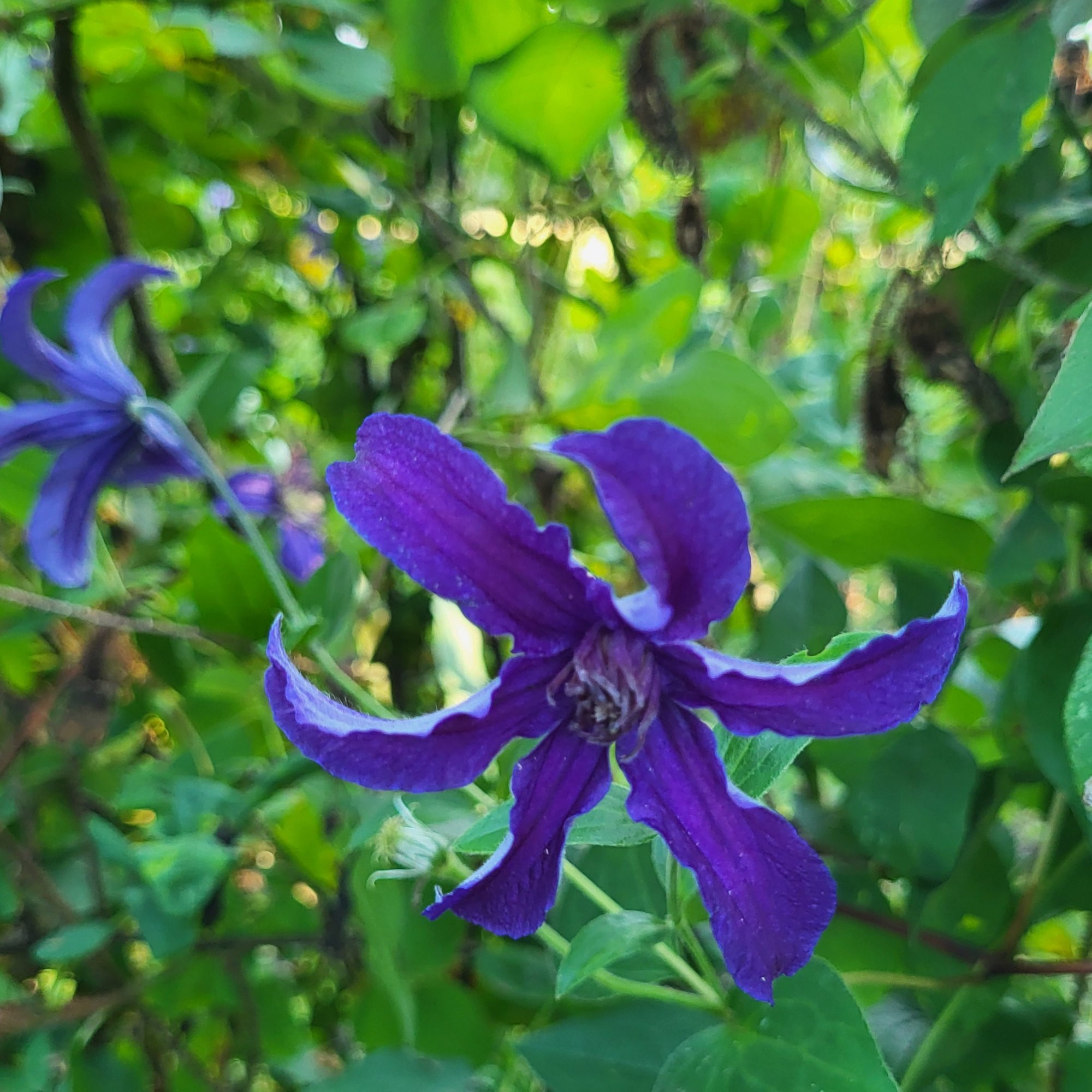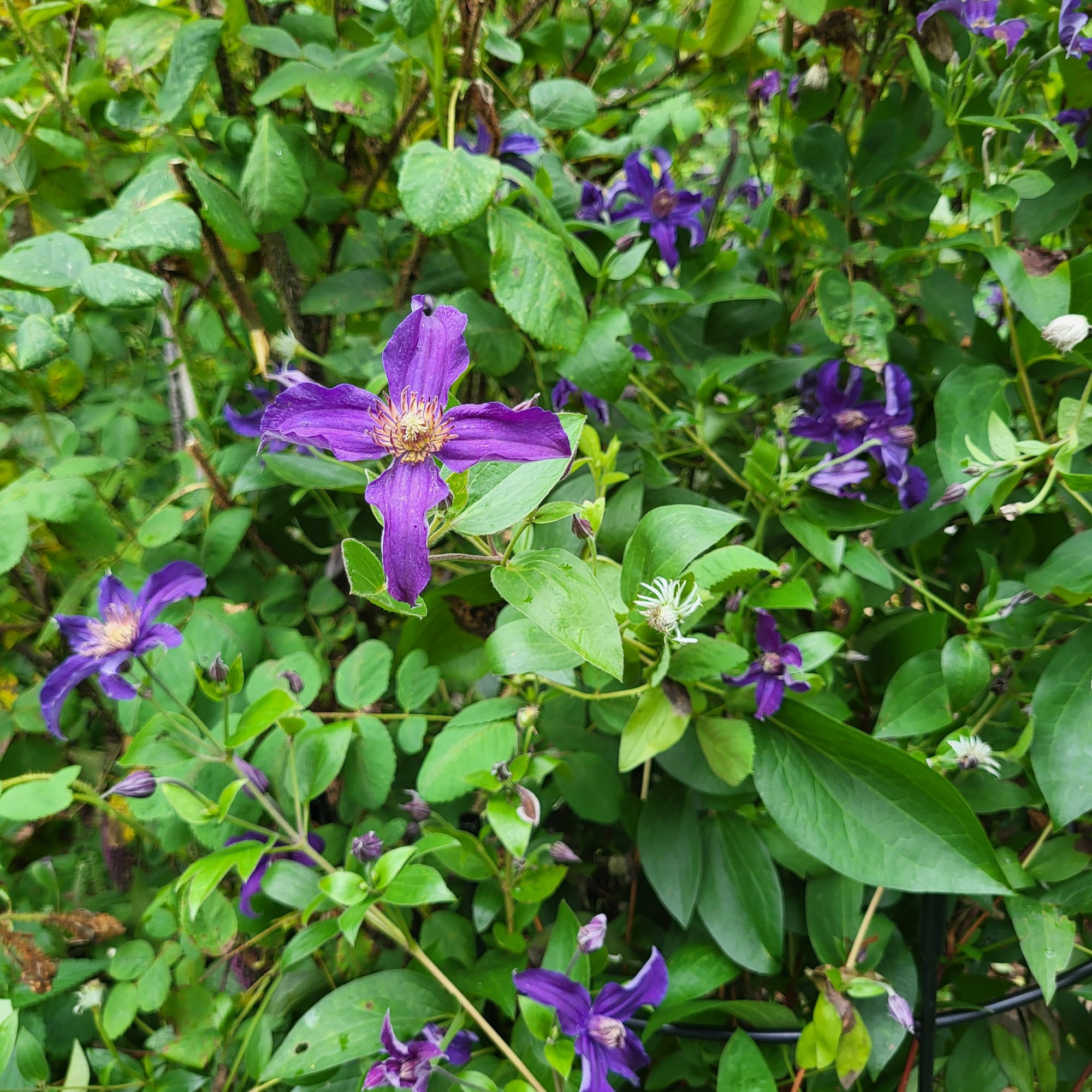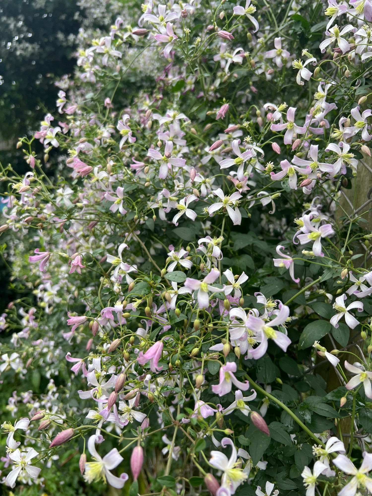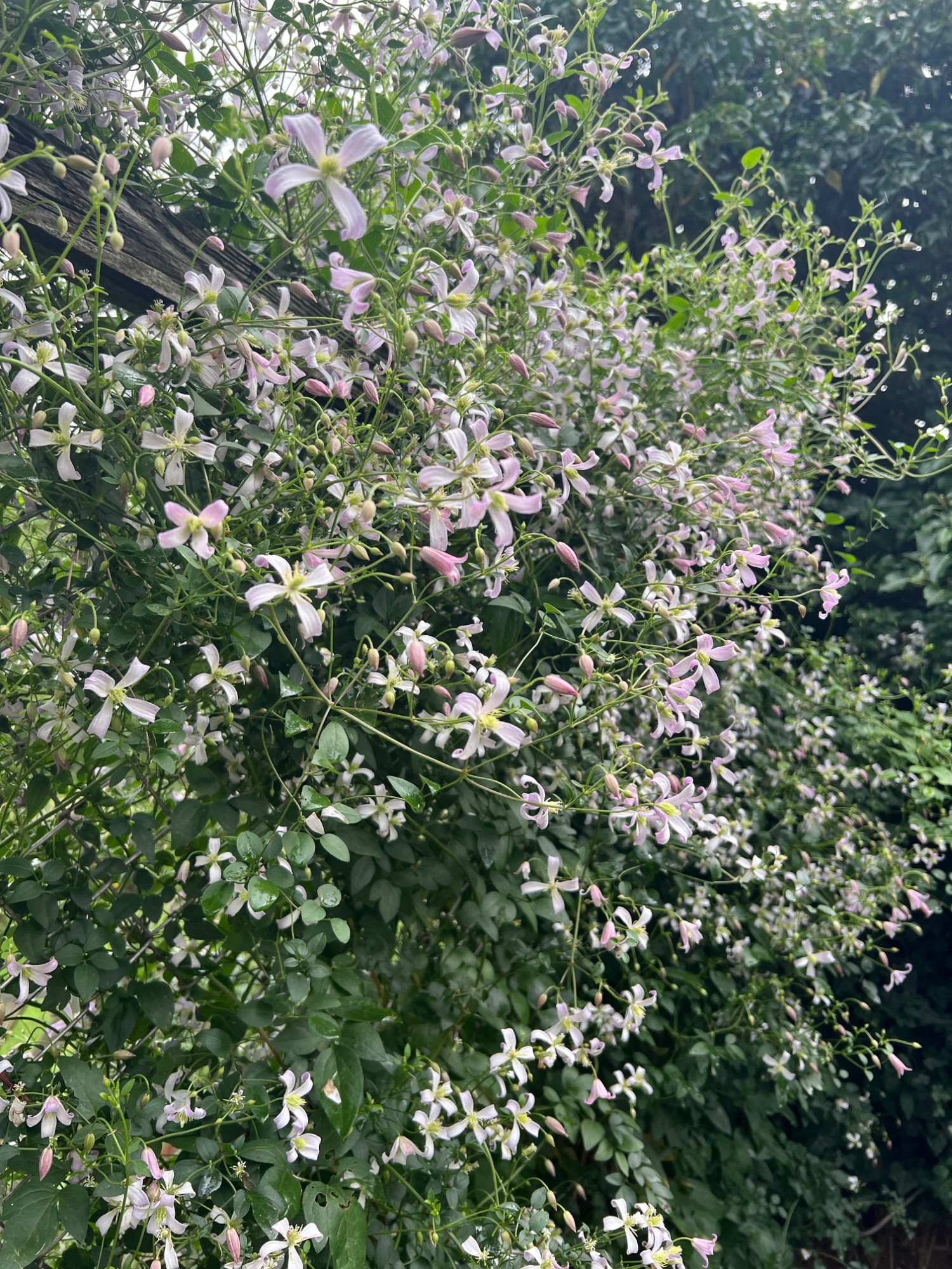 Eine meiner Mandschuricas blüht schon eine Weile als würde es kein Morgen mehr geben. Die beiden anderen am Zaun werden im Herbst umgepflanzt, der aktuelle Platz ist zu trocken, da wachsen beide nicht sonderlich. Leider möchte meine Viticella auch nicht blühen, der extrem heiße Tag hatte ihr sehr zugesetzt (sie ist erst vor ein paar Wochen an den jetzigen Platz gezogen). Eine großblütige Clematis wächst an der Rose und hat dann mal zwei, drei Blüten. Also ist es insgesamt hier nicht mehr so doll.