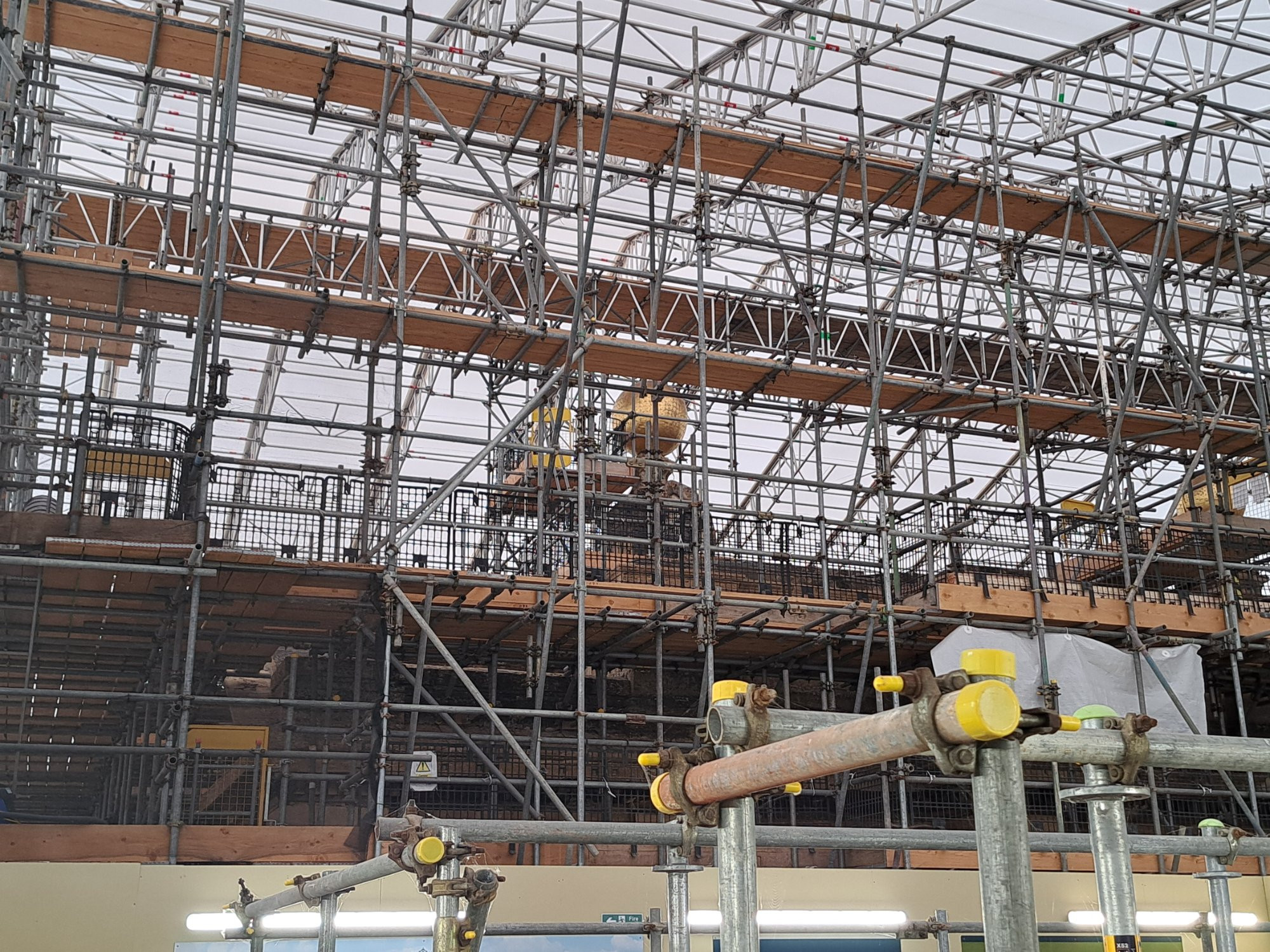 Vor der eingerüsteten und verhangenen Südfassade steht eine Fotoleinwand, damit man auch trotz Baustelle ein tolles Bild vor einem schönen Schloß mitnehmen kann:
