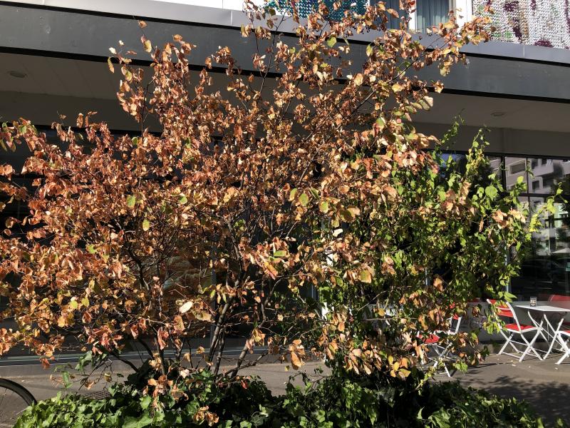 da jammert eine AMelanchier in einem betongefassten Pflanztrog in einer Nachbarstraße, Bild von vorgestern