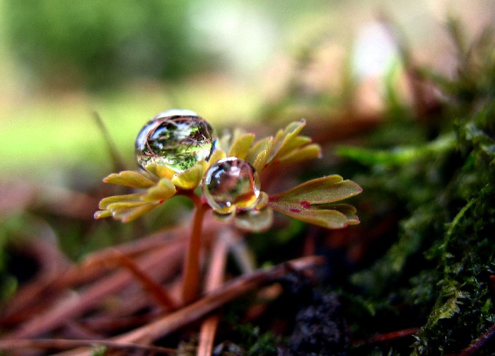 Nun noch etwas bunter. In den Tropfen spiegeln sich die frisch ausgetriebenen Pfirsichblätter.