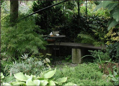 so, und da habe ich noch ein Bild von unserer Schattenecke - unter einer alten Jap. Zierkirsche haben wir einen kleinen Sitzplatz angelegt - denn bei 30°C im Schatten ist es nur in dieser Gartenecke über mittag auszuhalten... der Boden ist mit Rindenmulch belegt, ein bisschen Schnickschnack fuer's Auge ist auch untergebracht (Wasserbottich, kleiner Buddah, gesammelte Steine etc.) - aber leider auf dem Bild nicht so zu sehen... Die ganze Ecke war bis vor zwei Jahren noch ein einziger Urwald aus 30 Jahre altem Efeu, abgestorbenen anderen Zierbäumen etc. - im Grunde eine Höhle, die man nicht begehen konnte.