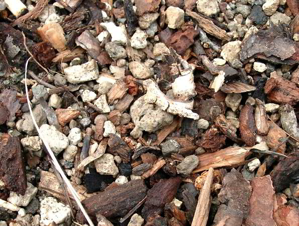 @brennnessel,schneckenzäune gibt's im ganzen garten nicht. mit den orchids habe ich ähnliche erfahrungen gemacht wie irm...da habe ich scheint's noch schmackhaftere pflanzen für die schleimer. danke für dein angebot wg. der samenkapseln von bletilla. ich beherrsche die asymbiotische samenvermehrung leider nicht und einfach ausstreuen bringt wohl nichts. ein freund hat eine großen horst von denen...die wachsen bei dem sogar durch kalksteinspalten durch...da bekomm ich welche.@tolmieaalso platzregen fürchte ich nicht. das bändchengewebe lässt schnell das wasser durch. und ein evtl. auftretender kurzer wasserstau im untergrund ist ja nicht unbedingt schlecht...der bimskies kann sich dann richtig vollsaugen und hält bei trockenheit länger feucht. die cypries stehen ja dicht unter der substratoberfläche und kommen mit evtl. kurzzeitig stauendem regenwasser nicht in berührung. hier mal ein foto, wie das substrat optisch aussieht...bimskies mit holzstücken aus abgelagerten holzhäcksel, aus dem ich die feinanteile kleiner ~1 cm rausgesiebt habe. nach der pflanzung der orchids wird der pflanzplatz zusätzlich noch mit kleineren kolz+rindenstücken abgedeckt, dann sieht man vom eigentlichen substrat nichts mehr. die bimskiessteinchen sehen nicht so aus wie zerkleinerte blähtonkügelchen, weil sie keine scharfen kanten haben und blähton rötlich braun aussieht. der bimskies hatte ja schon ~ 13.000 jahre zeit farbe und form anzupassen