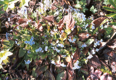 Omphalodes 'Starry Eyes' hat Frostschaden, läßt sich aber nicht beirren.
