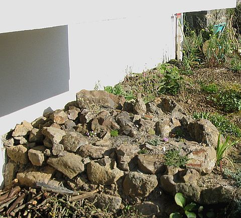Ich hatte aus der Not eine Tugend gemacht und beidseits eines Kellerabgangs unter einem Erker Steingartenbeete angelegt. Während des Sommers erhalten diese nur teilweise Sonne und in der heißen Jahreszeit lediglich ab Spätnachmittag, in der kühleren Periode, wegen der tiefer stehenden Sonne, hingegen fast ganztägig.