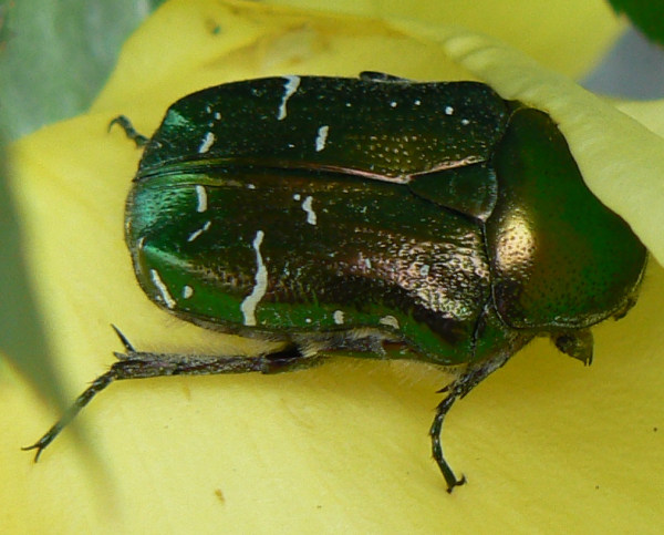 Und wer mag das wohl sein?Das Rätsel hat sich gerade auf anderem Wege gelöst: es ist ein Grüner Scheinbockkäfer, Oedemera nobilis