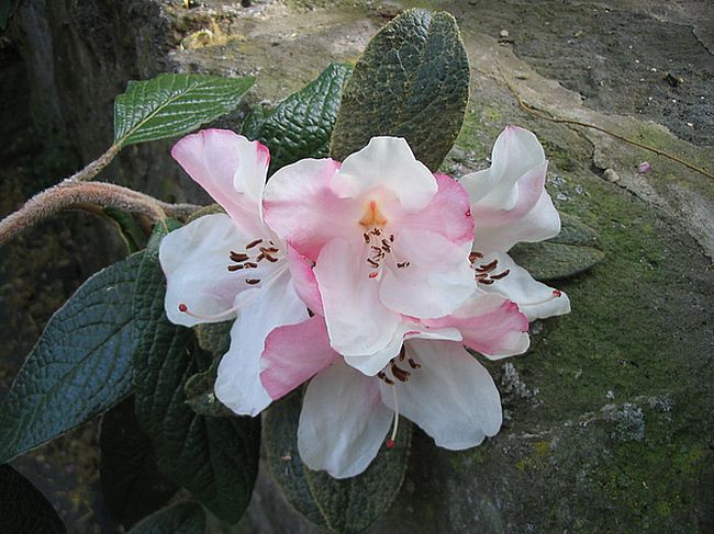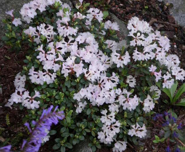 Ein sehr zartes Farbenspiel zeigt Rh. oreotrephes aus Süd-Tibet und Yunnan. Es gibt von dieser Art herrliche Auslesen, die auch wunderschöne Blattpflanzen sind mit blau getöntem Neuaustrieb.