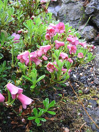 In der Blüte zwar nicht besonders schön. Interessant ist aber der absolut zwergige kissenförmige dichte Wuchs - nach 13 Jahren hat die Pflanze nicht mal 25 cm in Durchmesser und 15 cm in der Höhe erreicht. Es ist eine Züchtung von Wolfgang Reich (Rhododendron radicans x hanceanum nanum 'Radhan Baby').