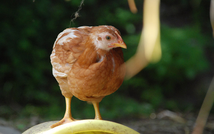 Hier ein Bild in Action. Es ist leider keins wirklich scharf geworden. Hühner machen offenbar im Moment des Zupickens die Augen zu.