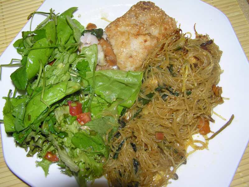 heute gabs den rest von gestern. die soße war völlig in die glasnudeln gezogen, so daß ich diese anbraten konnte.dazu ein stück fischfilet in einer mehl-sesam-mischung gewälzt und gemischten gartensalat dazu.