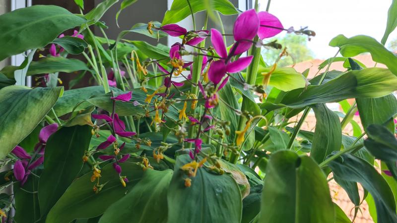 Passt nicht hierher, da Zimmerpflanze, aber Familie stimmt: Globba winitii blüht monatelang.