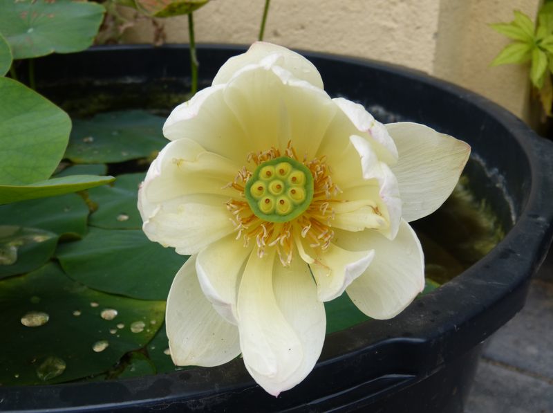 Meine Lotos-Blätter sind nun schon alle seit einiger Zeit verwelkt. Also wollte ich den freigewordenen Platz in der Veranda ausnutzen, schnitt alle vertrockneten Blätter ab und legte ein Brett über den Maurerkübel, worauf nun die diversen Pflanzen zum Winterurlaub gestellt werden können. Macht ja nichts, wenn der schlafende Lotos jetzt kein Licht bekommt.