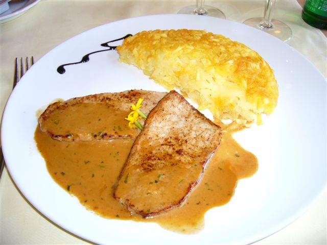 es gab:einen kleinen gemischten SalatSchnitzel an einer caramelisierten Estragonsauce, dazu Rösti