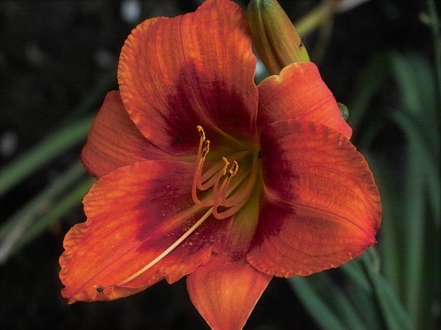 Nach der zarten Rosa jetzt ein antiker oranger Farbknaller: Fife and Drum (Wynne 1965).Das Auge ist dunkler als auf dem Foto. Umwerfender Kontrast, leider von der Form ein bißchen wie eine Trompetenlilie.