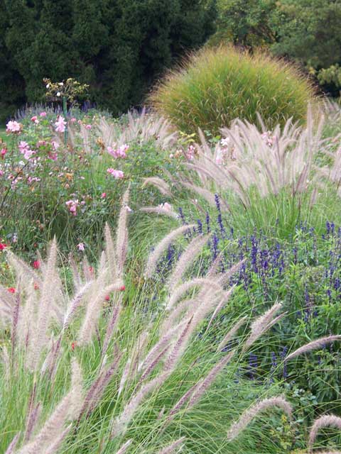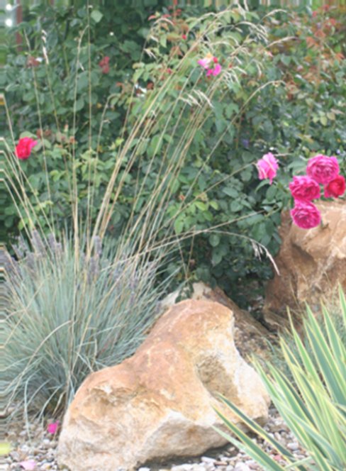Hier liefere ich noch, spät, aber doch (und wegen der Verkleinerung wie üblich unscharf, sorry) , das oben versprochene Helictotrichon-Rosen-Kombi-Foto nach: