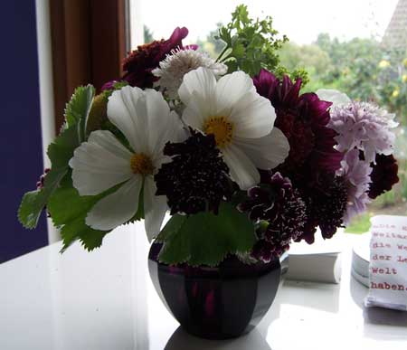 Den Strauß habe ich gestern für mich geschnitten. Er steht auf meinem Schreibtisch, so habe ich auch bei der Arbeit immer einen schönen Blick drauf. Und da sind: Dahlien (Sorte Mambo), weiße Kosmeen, meine wunderbaren Gartenskabiosen, und Frauenmantel. Grüße Tubutsch