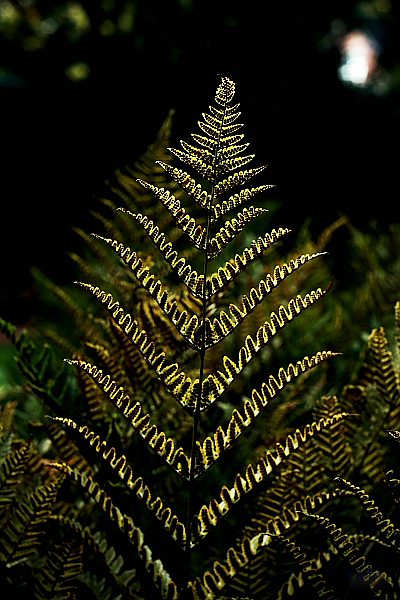 Auf dem Original kann man besser sehen, was die spektakuläre Wirkung verursacht. Es sieht ja aus, als wäre es eine Beleuchtung durch Neonschlangen. Es sind die Sporen in der Mitte jeden Fiederblättchens, die dunkel geblieben sind, nur der Rand leuchtet in der Sonne. Toll