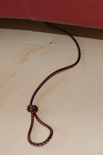 An die Schnur binde ich ein gelochtes Leckerli, werfe es unter ein Sofa, das so niedrig ist, das weder Hund noch Katze darunter kommen. Sie ziehen es dann an der Schnur hervor.