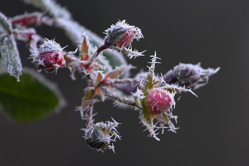Das ist aber doch ein Raureifmotiv.Diese schrumpeligen geeisten Hagebutten sind ein schönes Übungsmotiv.Versuch´ doch mal den Hintergrund etwas verschwimmen zu lassen, also mit geringer Schärfentiefe zu fotografieren.Mit welcher Kamera fotografierst du?