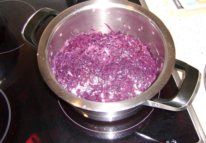 Hier das Blaukraut oder auch Rotkraut genannt. In Bayern heissts Blaukraut  ;)Wird ganz einfach gehobelt, ein Apfel dazu und Salz und Pfeffer und ein kleiner Schuss Zitronensaft für die Säure.