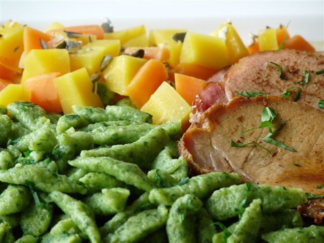 Spinatspätzli? Gibt es da nicht eher Knödel?Der bayerische Klassiker!danach Schweinebraten, Spinatspätzli, Karotten