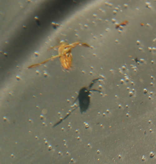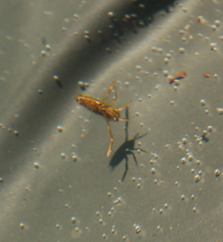 Juchhuhu! Der erste Besiedler des Teiches hat sich heute morgen eingefunden.Er schwimmt, taucht unter, kommt wieder hoch (um Luft zu schnappen?). Bei Bewegung versucht er sich in den Falten der Folie zu verstecken. Er ist ungefähr 2 cm lang.Leider sehr schlecht mit dem Fotoapparat einzufingen. Kann er fliegen? Muss wohl, oder? Der wird ja wohl nicht zu Fuss hierhergewandert sein?Wer kennt ihn, wer weiss was das ist?Und was muss ich dabei beachten?