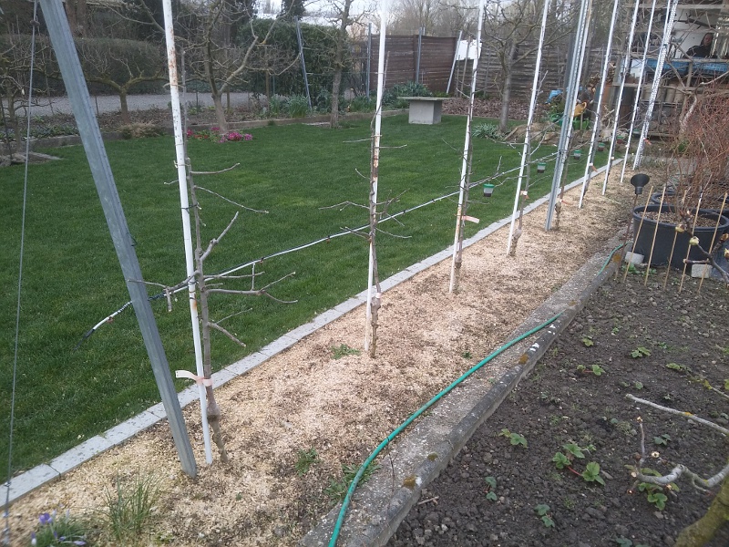 Ich muss dazusagen, das sind nicht meine einzigen Äpfel, andere Sorten sind mir teilweise lieber, die haben es nur nicht in diese Reihe geschafft weil die eben mal gepflanzt werden musste. Insgesamt habe ich wohl um die 30 Apfelsorten, man muss eben probieren als Apfelallergiker wenn man nichts kaufen kann außer Boskoop. Die französischen Kanadarenetten sind zu wüchsig für das System, das zeichnet sich jetzt schon ab, habe noch 2 einjährig okulierte Berlepsch rumstehen und überlege, ob ich die trotz 2 Jahre Versatz doch noch als Ersatz pflanzen will. Ich glaube nicht dran, die bekommen wohl eine andere Ecke. Für 3 so kleine Bäumchen findet sich schließlich immer irgendwo ein Platz.