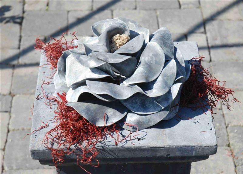 Ich war heute mal kreativ. Habe von unserem Blechner Bleiband organisiert Rosenblätter davon ausgeschnitten auf eine lange Schraube gereiht, festgesetzt und gebogen. Die Schraube ist vorher durch die Säule gebohrt und festgestellt.