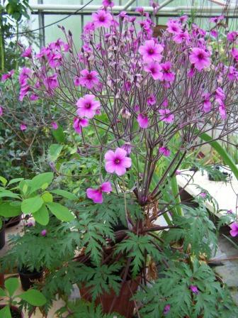 Heute bei einer Kollegin im Glashaus gesehen: Ein Madeira-Storchschnabel. Ist wohl eher eine Kübelpflanze, aber hat mir sehr gefallen. Beim gugeln habe ich eben gelesen, dass die Pflanze angeblich nach der Blüte abstirbt.