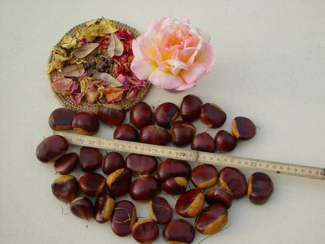 Wir wohnen zwar "jenseits" des Limes, sozusagen im "unbesetzten Gallien, ähem, Germanien", aber es sind nur wenige Kilometer, etwa 15 Minuten mit dem Auto, um "Rüberzumachen" in den römisch besetzten Teil und zu sammeln, und so gibt es in Kronberg, Königstein, Oberursel und anderswo am südlichen Taunushang herrliche Wälder mit Eßkastanien, dort unten ist es im Gegensatz zu uns auch viel milder und eigentlich sollte ich in den nächsten Tagen schon mal schauen, ob sie schon fallen, momentan prasseln bei uns die Eicheln und Bucheckern, ist ein echtes Mastjahr.Eßkastanien der "Kestebäume" aus Kronberg hat sich schon Goethe von seiner Mutter nach Weimar schicken lassen