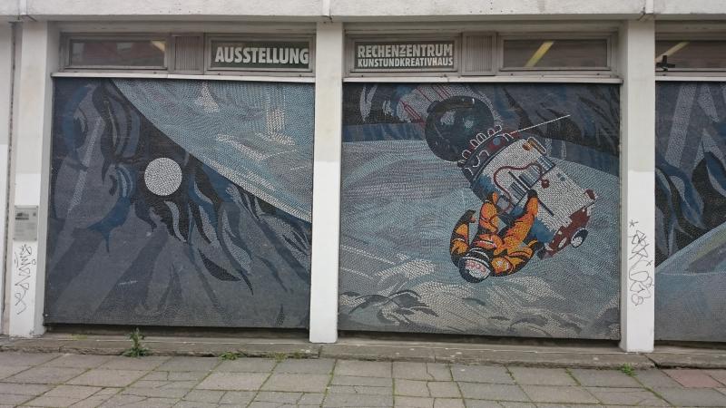 Das Glasmosaik "Der Mensch bezwingt den Kosmos" ist nicht weit davon. Der 70 m lange Bilderzyklus aus 18 Tafeln, jeweils 3 m hoch, entstand 1971/72.