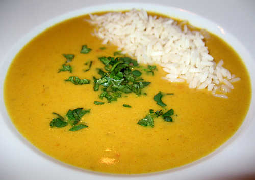 Ich hatte heute Zucchini-Kokossuppe mit Reis (Zucchini vom Sommer, Koriander frisch aus dem Garten). Davor gab es Endivien-Rübenblätter-Salat.
