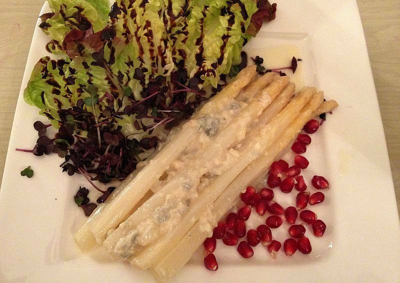 in weißwein und gorgonzola gegart mit granatapfelkernen