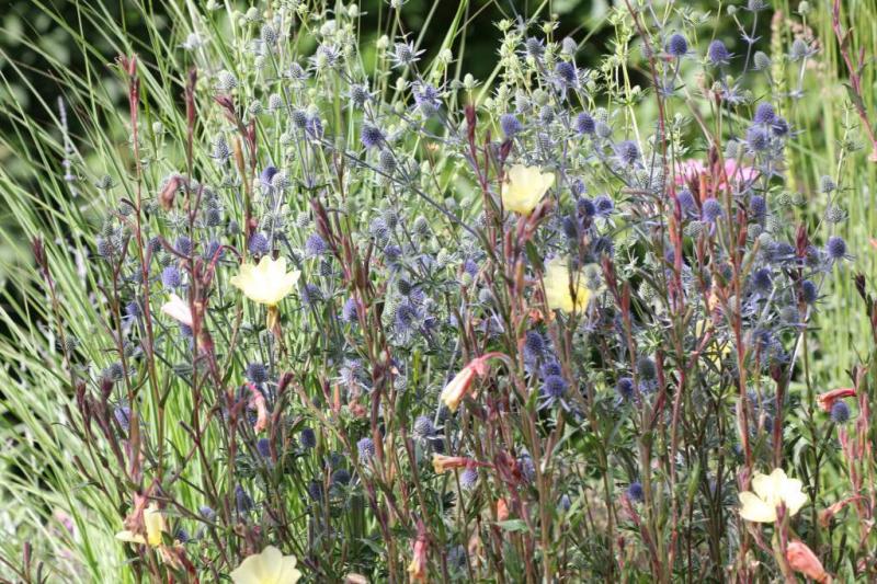 Die Frage passt ganz gut hier rein, auch wenn der Thread schon etwas älter ist. Ich habe 2013 oder 14 Eryngium planum "Blaukappe" und E. tripartitum gesät, und dieses Jahr blühen beide. Dummerweise habe ich jetzt beide zusammengesetzt, und jetzt sehe ich keinen Unterschied zwischen beiden. Die Bilder im Netz geben leider auch keinen Aufschluß. Beide bläulich, mit blälichen Stielen. Kann mir jemand da helfen?Hier die beiden zusammen: