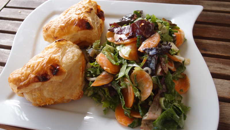 es gab blätterteigtaschen mit hackfüllung, dazu salat mit frühlingszwiebeln und karotten.