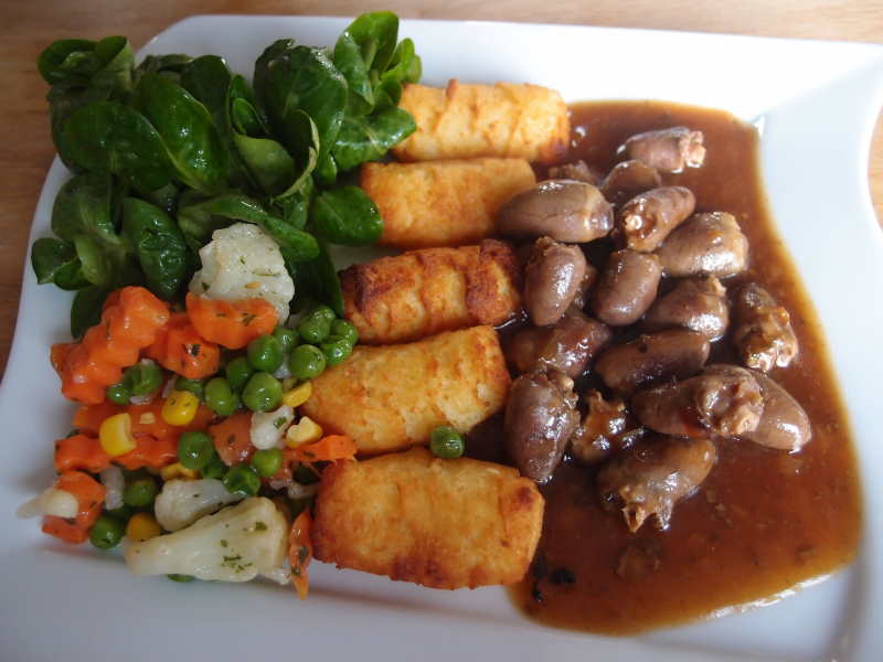 gestern für den liebsten rouladen und für mich, nach eeewigkeiten mal wieder, hähnchenherzen. dazu auf herrenwunsch kroketten und buttergemüse. für mich noch einen rest ackersalat.