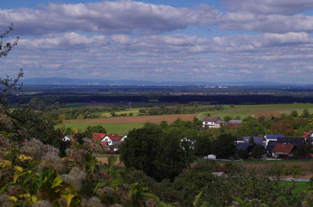 so spektakuläre Ausblicke wie sumava, kudzu und Frühling habe ich nicht zu bieten, aber wenn ich ein paar Schritte aus dem Garten ein wenig hochgehe habe ich einen wunderbaren Rundblick. Es ist hier relativ dicht besiedelt, irgendwelche Gebäude hat man immer im Blick.Richtung Norden sehe ich den Taunus mit Frankfurt davor