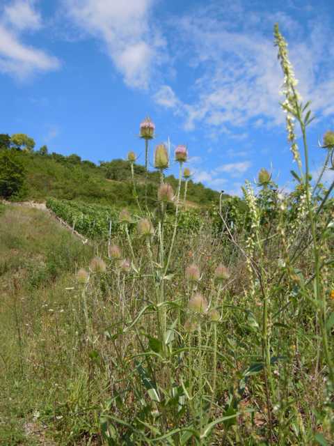Dort ist es jedenfalls nicht feucht. Der Boden besteht fast nur aus Muschelkalksteinen. Eine der trockensten Regionen in D.Ich hab mal ein altes Foto, aus einem anderen Weinberg. Das müsste die Pflanze sein.