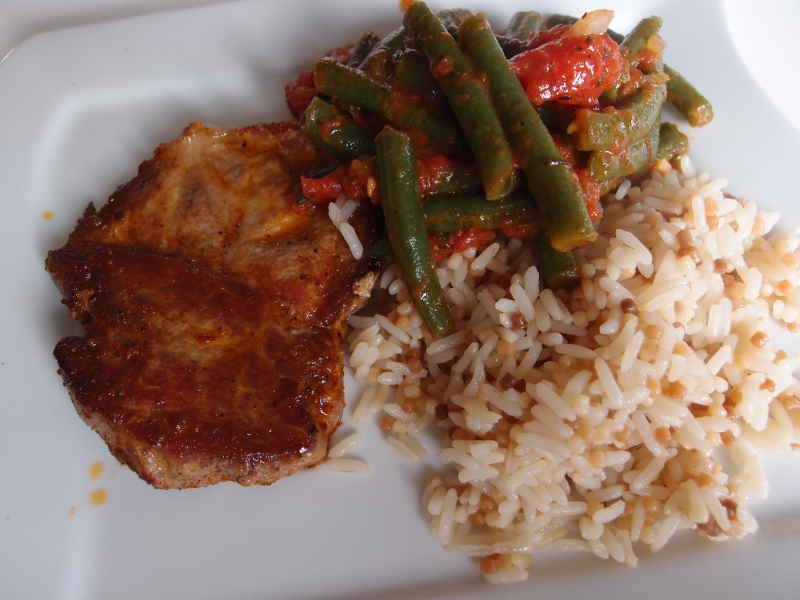 wir hatten am montag schweinehals, grüne bohnen mit tomaten und türkischer reis.